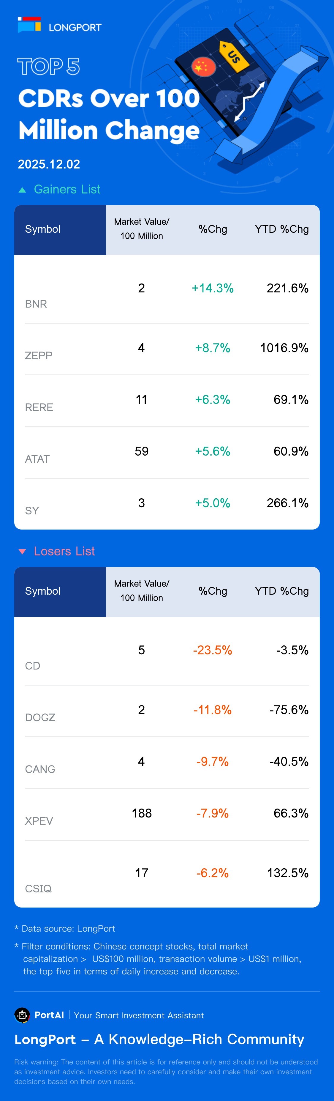 Burning Rock Biotech(BNR) rose 14.32%, with a trading turnover 1.4 Million USD, and a year-to-date rose 221.6%. Zepp Health(ZEPP) rose 8.72%, with a trading turnover 4.7 Million USD, and a year-to-date rose 1016.9%. Chaince Digital(CD) fell 23.46%, with a trading turnover 2.2 Million USD, and a year-to-date fell 3.5%. Dogness(DOGZ) fell 11.83%, with a trading turnover 12.4 Million USD, and a year-to-date fell 75.6%.