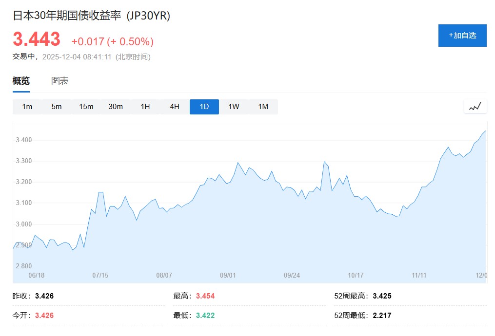 Wallstreet.cn reported that as market expectations for a rate hike by the Bank of Japan in December have surged, Japanese government bond yields have soared to multi-decade highs. The latest market data shows that the yield on 30-year Japanese government bonds rose by 2.5 basis points to 3.445%, marking the highest level since the issuance of this maturity bond in 1999.