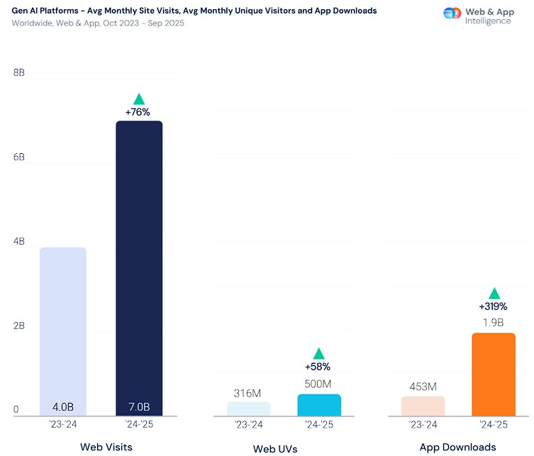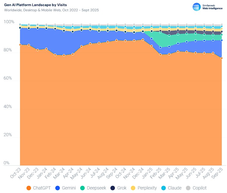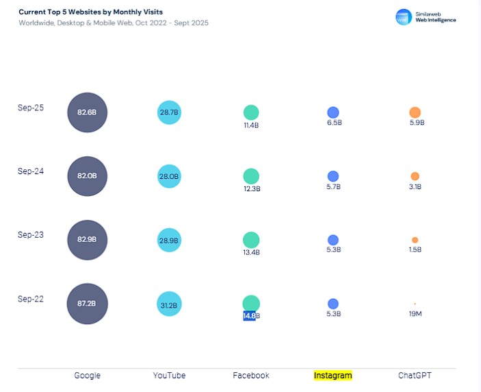 ChatGPT's market dominance remains solid. OpenAI's platform has grown from approximately 19 million monthly visits in 2022 to about 5.9 billion in September 2025, making it one of the top five websites globally, on par with Instagram's 6.5 billion monthly visits.