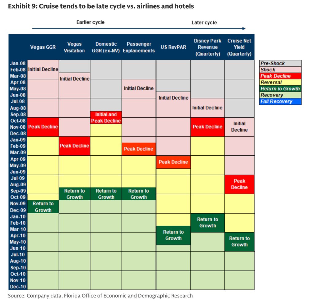 這意味着,郵輪行業的晚週期低迷與拉斯維加斯及航空業的早週期回撤之間,存在整整 18 到 24 個月的滯後。