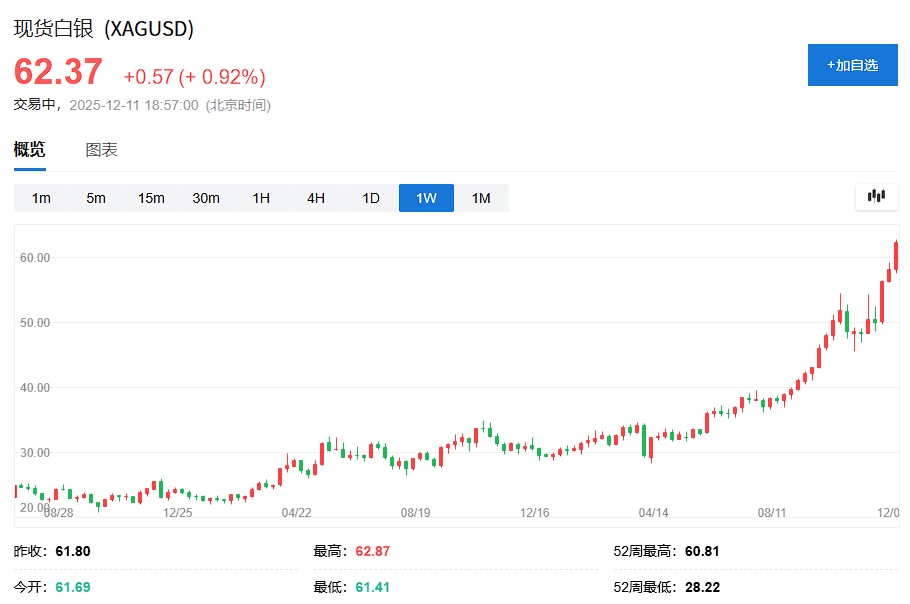 Spot silver has risen 114.6% year-to-date, reaching a historical high of $62.88 per ounce on Wednesday, and as of the time of writing, it stands at $62.37. Silver futures have also soared by 113%, breaking the $61 mark for the first time this week. Just a day earlier, silver had historically broken through the $60 barrier.