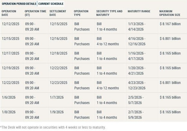 Wall Street Insight previously mentioned that on the same day the Federal Reserve announced this plan, the New York Fed stated it would release the first plan on December 11, 2025, and begin purchasing on December 12. This also means that the Federal Reserve will purchase $8.2 billion in short-term Treasury bills (T-bills) this Friday and plans to buy $40 billion in the following month to rebuild bank system reserves, aiming to alleviate short-term interest rate pressures through the reconstruction of financial system reserves.