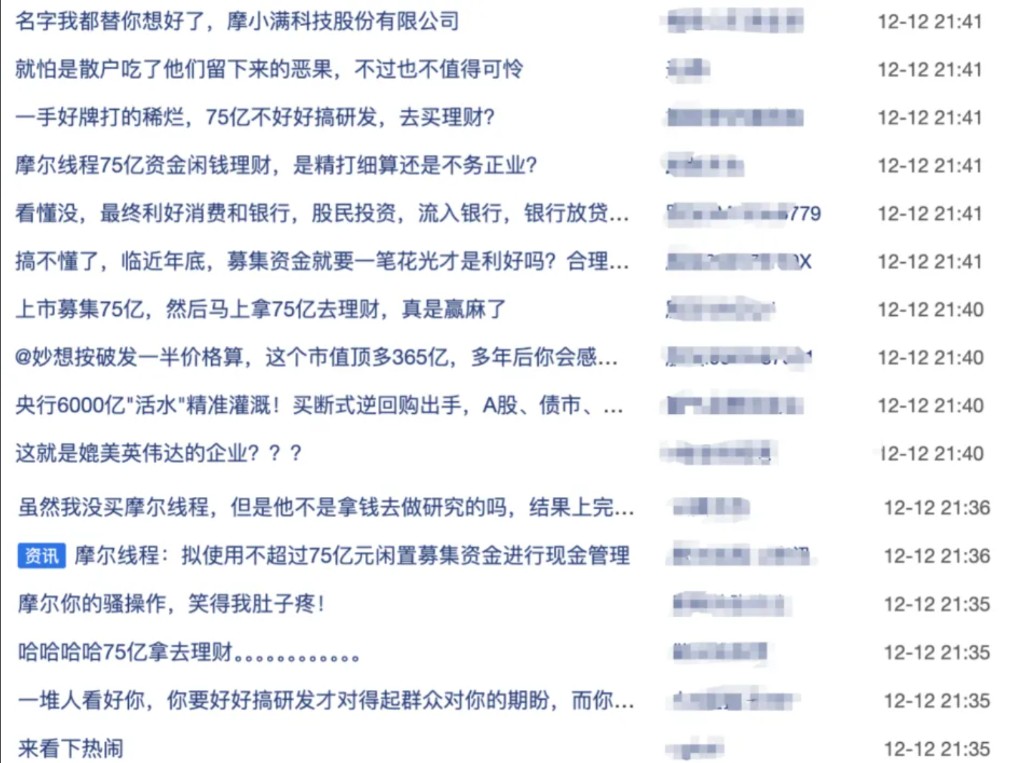 摩爾線程公告發布後,很快引來了投資者們的關注。有投資者在其股吧質疑,“75 億不好好搞研發,去買理財?”“是精打細算還是不務正業?”。也有部分投資者對其行為表示支持,認為 “合理利用資金保證現金充足的前提下,增加營收而已。”