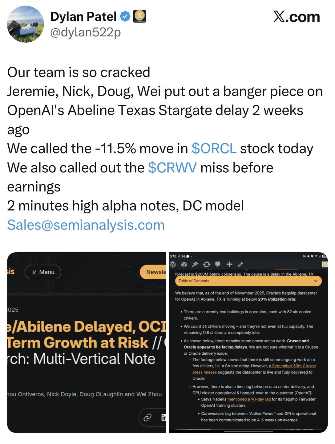 The incident began when its founder Dylan Patel boldly claimed on Thursday that the team's previous research on the delay of OpenAI's data center in Abilene, Texas "hit the mark," not only pointing out project progress issues two weeks in advance but also "accurately predicting Oracle's stock price plummeting by 11.5% on that day," with quite a confident tone.