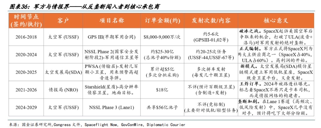 The report specifically mentions that in collaboration with the National Reconnaissance Office (NRO), SpaceX's role has evolved to "both building satellites (based on the Starlink platform) and launching," indicating its deep integration into the U.S. national security system.