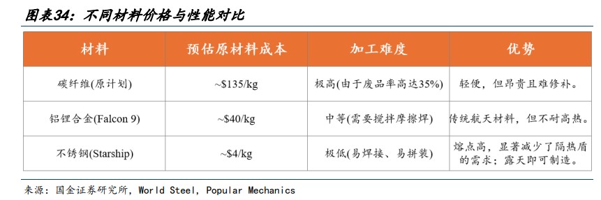 The report cites data showing that although stainless steel is heavier, its cost is only about one-fiftieth that of carbon fiber (USD 2,500 per ton vs. USD 130,000 per ton), and it possesses excellent low-temperature strength and high-temperature resistance. More importantly, the stainless steel material allows SpaceX's Star Factory to "iterate spacecraft as quickly as shipbuilding."
