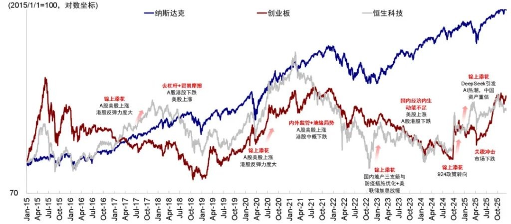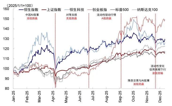 2025 年初以來,美 A 港三地市場呈現以季度維度的切換脈絡,既有此消彼長的 “蹺蹺板” 效應,也有跨市場間的映射聯動。一季度 DeepSeek 引領中國資產重估,恆科領跑;二季度美國對等關税後,美股憑藉 AI 龍頭超預期業績與資本開支漲幅居前,港股新消費和創新藥啓動,但恆科始終沒回到 3 月高點;三季度國內資金入市敍事強化、科創算力行情推動 A 股後來居上;9 月 “寬鬆交易” 與中國互聯網龍頭 AI 敍事強化,一度使港股再度跑贏。
