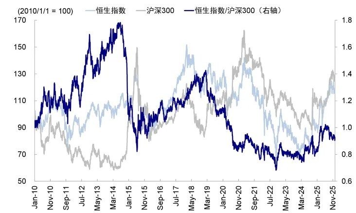 港股通常在基本面修復、外部流動性寬裕或者有明確結構性機會的情況下跑贏。2010 年以來,港股跑贏 A 股的時期主要是 2010 年初-2012 年 12 月、2013 年 9 月-2014 年 7 月、2015 年 6 月-2019 年 1 月、2022 年 10 月-2023 年 1 月、2024 年 4 月-2025 年 6 月。歸納看,主要有以下因素助推港股跑贏: