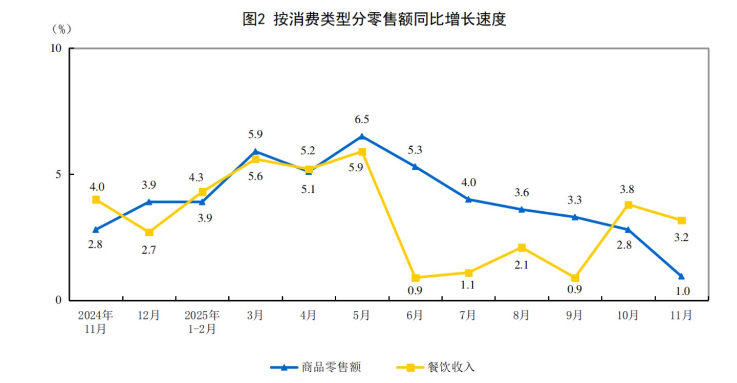 The decline in automobile and home appliance retail has widened, with China's retail sales of consumer goods in November growing at a year-on-year rate of 1.3%