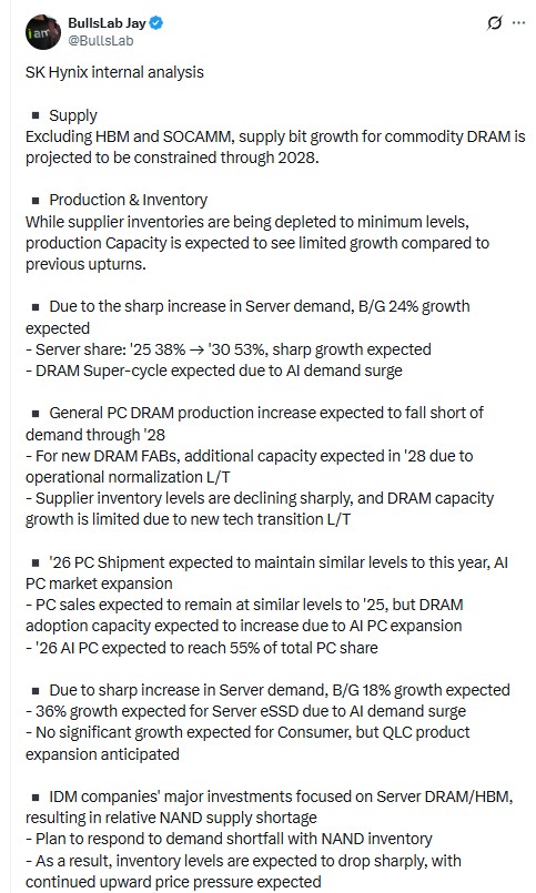 據社交平台 X 用户 @BullsLab 上週分享的截圖,SK 海力士認為標準 DRAM 的產能增長將受到嚴重製約。供應商庫存正被消耗至最低水平,而生產產能相比以往上升週期預計增長有限。