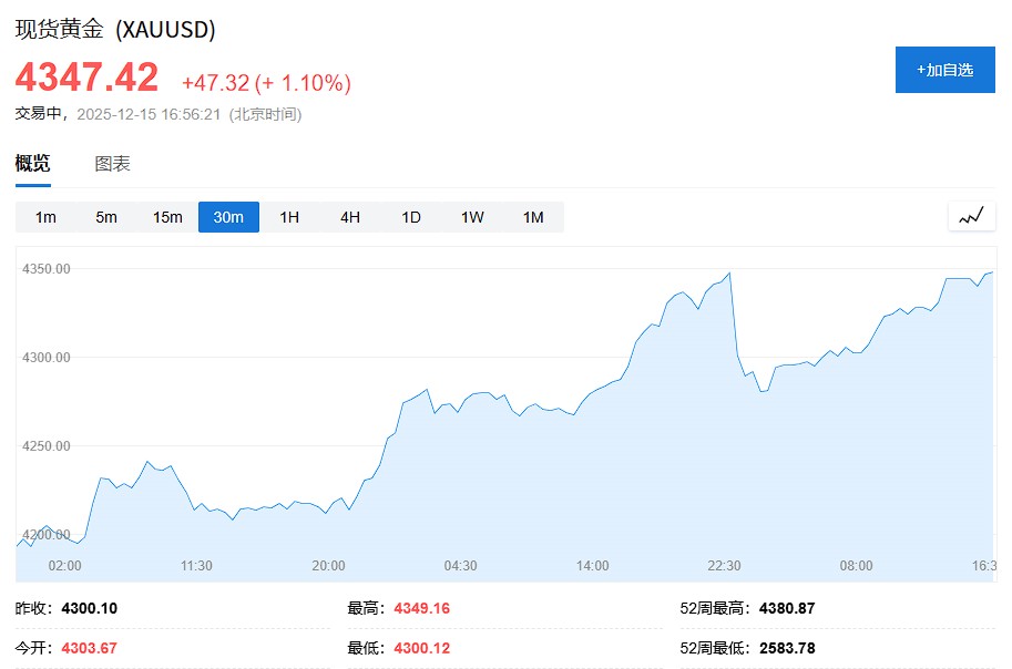 Spot gold rose more than 1% during the day, currently reported at $4,347.42 per ounce.
