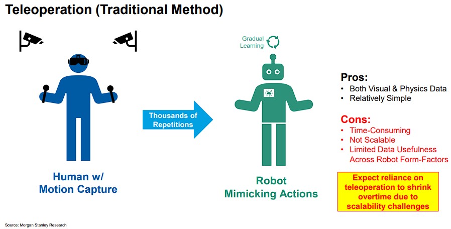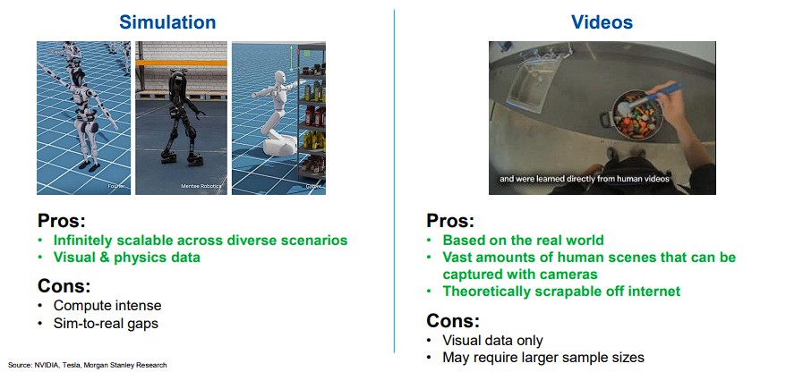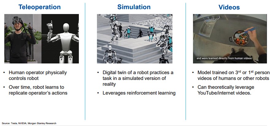 該行指出,特斯拉、英偉達、谷歌等科技巨頭正在通過遠程操作、模擬訓練和視頻學習三種主要方式收集訓練數據。