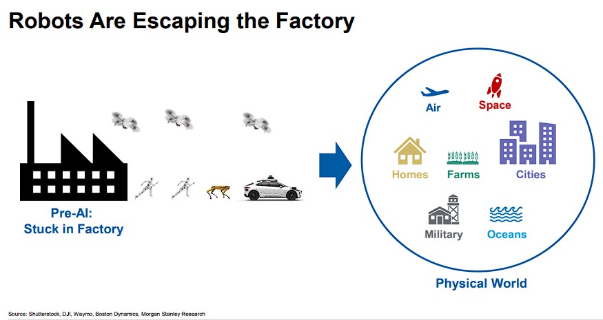 大摩指出,AI 賦能的新一代機器人正突破這一限制,開始進入家庭、農場、城市街道、深海甚至太空——例如自動駕駛汽車在擁擠路段導航、服務機器人在家庭中抓取物體、無人機在複雜地形巡檢。