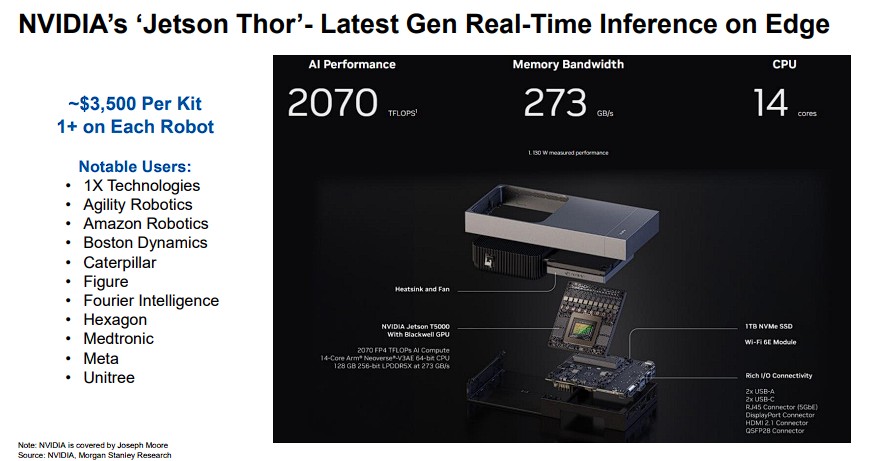 英偉達的 Jetson Thor 是典型代表,作為邊緣實時推理設備,每套件價格約 3500 美元,已被波士頓動力、亞馬遜機器人等企業採用。其核心優勢在於低功耗下實現高算力,滿足機器人對實時性(如動態避障)的要求。