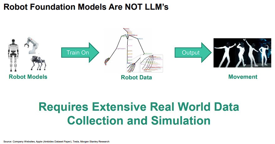 據大摩研究,與大語言模型主要訓練文本和圖像數據不同,機器人模型需要大量真實世界的物理操作數據,這使得數據收集和模型訓練變得更加複雜且昂貴。