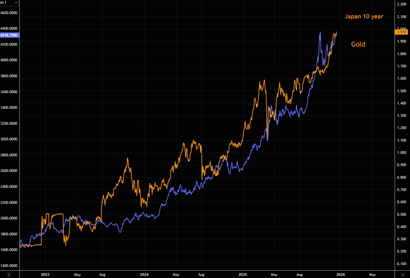 近年來,黃金價格與日本 10 年期國債收益率走勢幾乎一致。