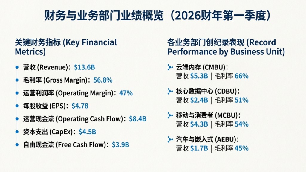 现在转向按业务部门划分的季度财务表现。云端内存业务部(CMBU)收入为创纪录的53亿美元,占公司总收入的39%。CMBU收入环比增长16%,由位元出货量增加和更高价格驱动。CMBU毛利率为66%,环比提高620个基点,得益于成本执行和更高定价的支持。核心数据中心业务部(CDBU)收入为创纪录的24亿美元,占公司总收入的17%。CDBU收入环比增长51%,由强劲的位元出货量和更高价格驱动。CDBU毛利率为51%,环比提高990个基点,得益于更高定价和成本执行的支持。移动与消费者业务部(MCBU)收入为创纪录的43亿美元,占公司总收入的31%。MCBU收入环比增长13%,主要由更高定价驱动,部分被较低的位元出货量抵消。MCBU毛利率为54%,环比提高17个百分点,主要由更高定价驱动。汽车与嵌入式业务部(AEBU)收入为创纪录的17亿美元,占公司总收入的13%。AEBU收入环比增长20%,由更高的位元出货量和更高价格驱动。