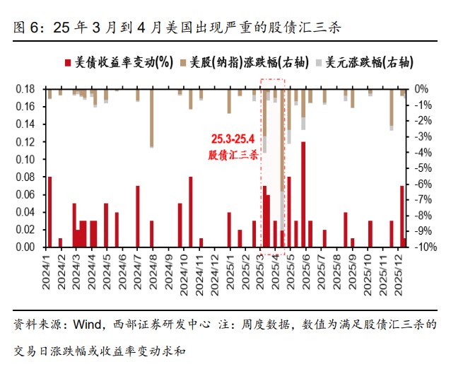 情景二: 如果資金恐慌真的誘發了全球流動性衝擊,投資者需要密切跟蹤一個關鍵信號——美國市場是否連續出現 2-3 次 “股債匯三殺”(即股市、債市、匯市同步下跌)。報告指出,類似今年 4 月初的情況一旦重演,則表明市場出現流動性衝擊的概率明顯增強。