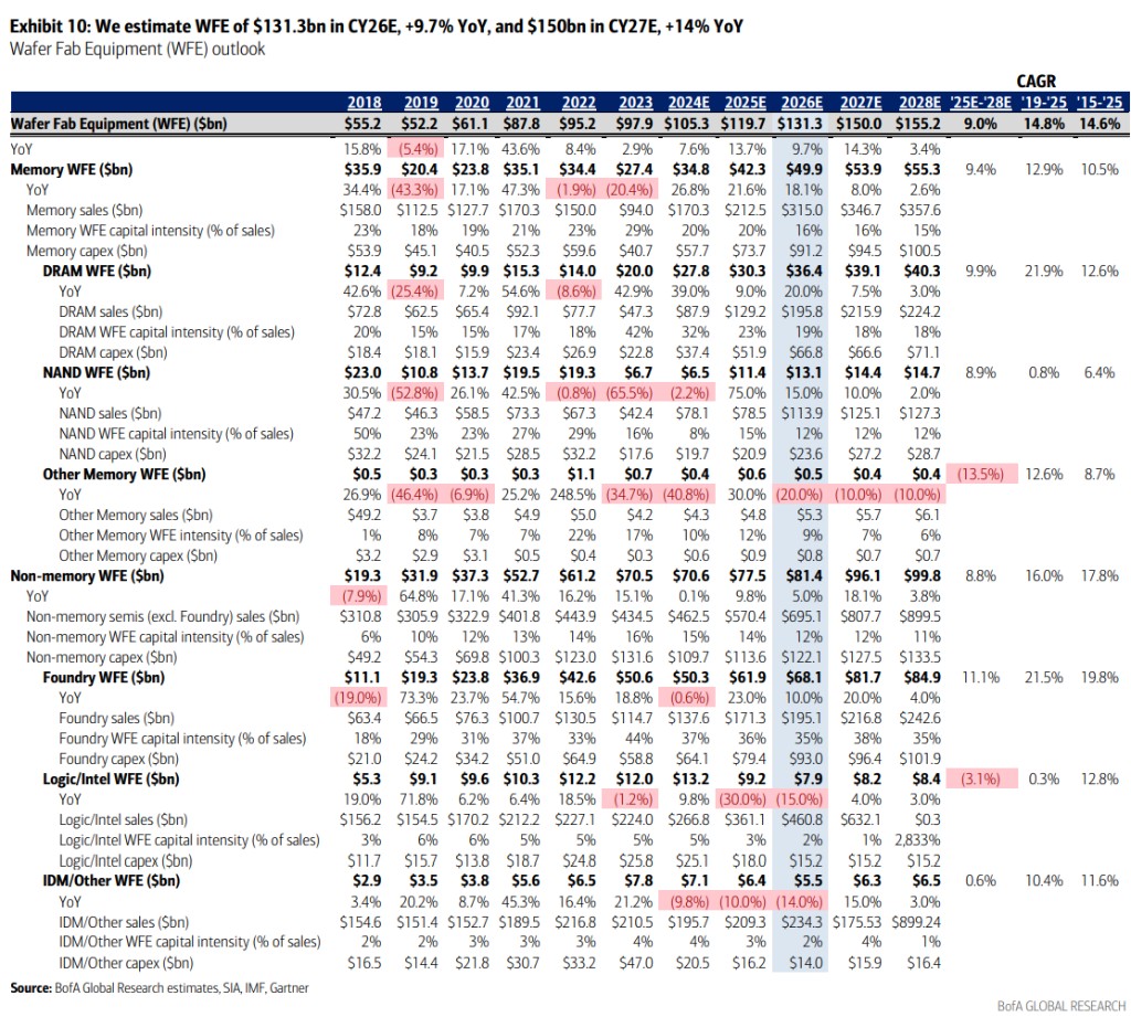 美銀認為,儘管 AI 投資回報和超大規模雲服務商現金流面臨更嚴格審視,可能導致股價波動,但更新更快的大語言模型構建者以及服務企業和政府客户的 AI 工廠將抵消這一影響。半導體設備成 AI 和回流趨勢的” 無名英雄”,報告預測,2026 年晶圓製造設備 (WFE) 銷售額將實現近兩位數同比增長。