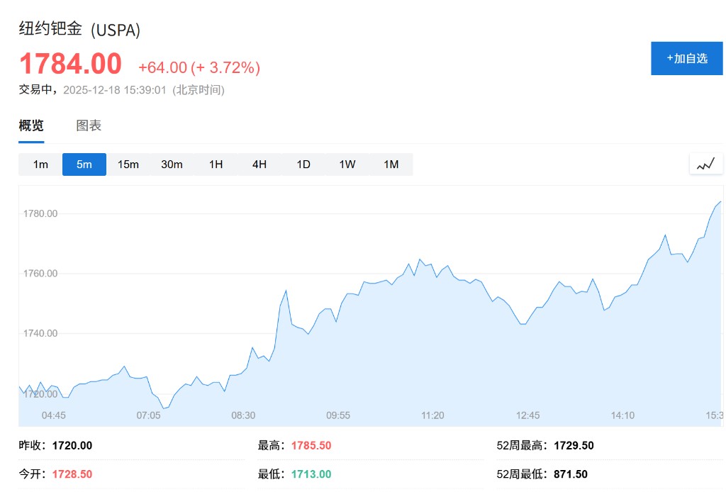 現貨鈀金突破 1700 美元/盎司,為 2023 年 2 月以來首次,日內漲超 3%。