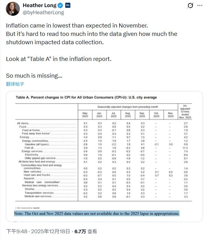 Heather Long, chief economist at Navy Federal, commented: "The inflation rate in November was lower than expected. However, considering the significant impact of the government shutdown on data collection, it is difficult to make too much interpretation of these data." "He screenshot and showed that there are many missing data points in 'Table A' of the BLS CPI report.