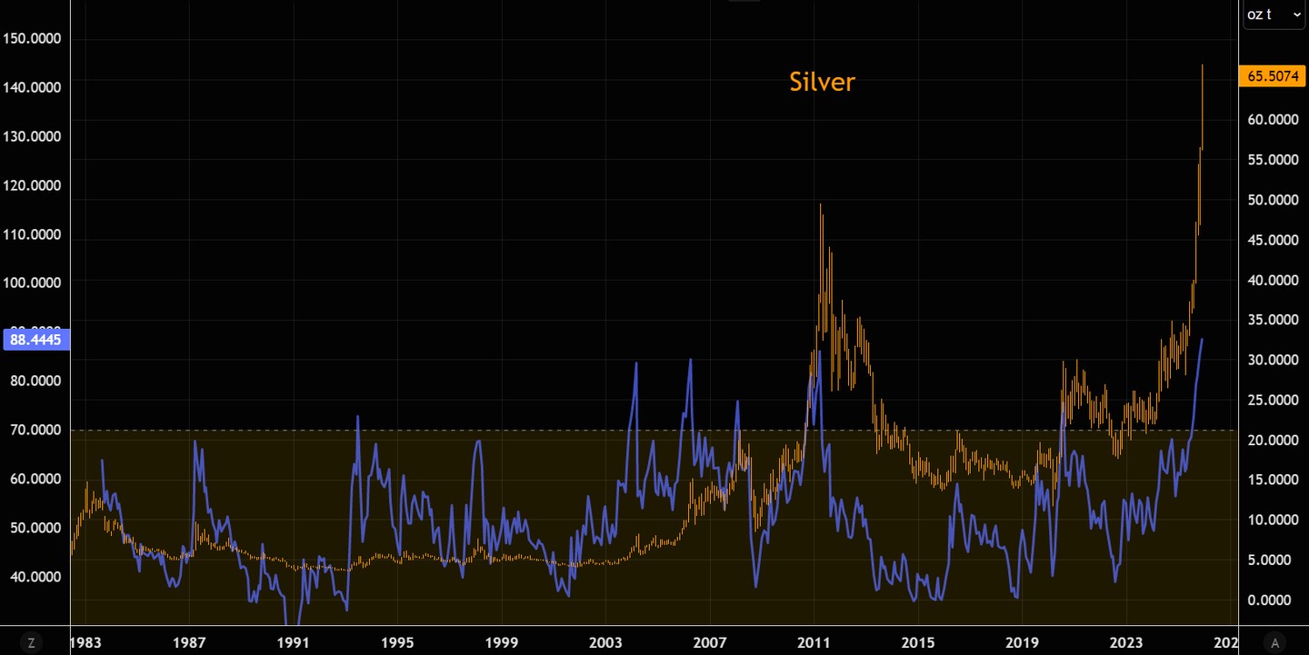 As silver soars (yellow line), market sentiment is high, with the monthly relative strength index (RSI, blue line) for silver at 88, reaching an all-time high