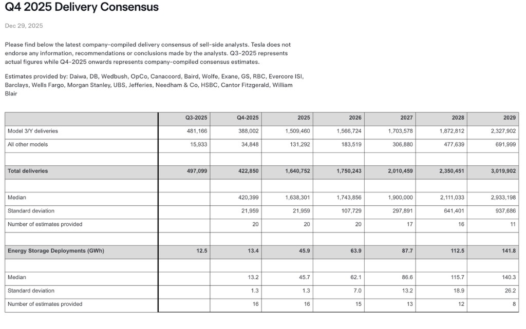 Tesla's proactive move to publish the average analyst estimates on its investor relations page is uncommon. According to Tesla's compiled data, the market's view on its fourth-quarter performance is more conservative than external agency surveys. The Visible Alpha survey shows that analysts expect Tesla's fourth-quarter deliveries to be 432,810 vehicles, a year-on-year decrease of about 13%, slightly better than the 15% decline compiled internally by Tesla.