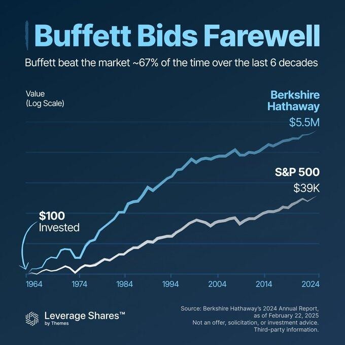 Buffett leaves behind a record etched in financial history: since he took the helm, an initial investment of $100 has grown to approximately $5.5 million (based on the price of Berkshire Hathaway Class A shares), while the S&P 500 index has returned about $39,000 during the same period. His portfolio has outperformed the market benchmark approximately 67% of the time.