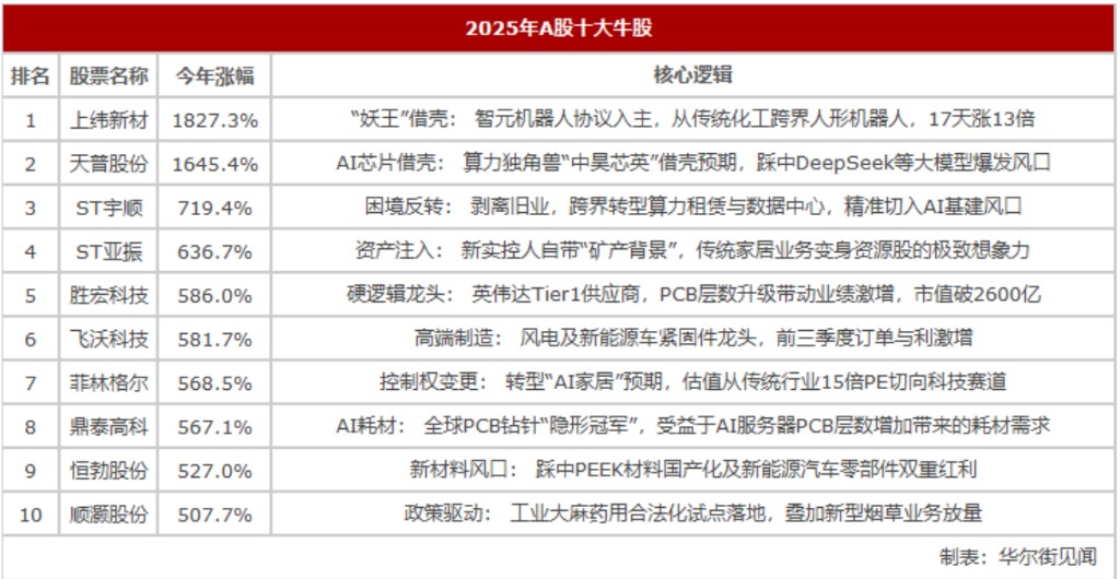 According to Wallstreetcn, as of the close on December 31, the top ten A-share stocks for 2025 are Shangwei New Materials, Tianpu Co., Ltd., ST Yushun, ST Yazhen, Shenghong Technology, Feiwo Technology, Feiling'er, Dingtai High-tech, Hengbo Co., Ltd., and Shunhao Co., Ltd.