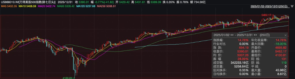 It is noteworthy that this highly concentrated market structure is accumulating significant risks. Currently, the market capitalization of the "seven giants" represents nearly 40% of the total market capitalization of the S&P 500 index, a historical high. Data shows that in 2025, the Wind U.S. 500 index, excluding the seven tech giants, had a growth rate of 14.78%, significantly lagging behind the overall performance of the S&P 500 index, which includes the giants at 16.39%.