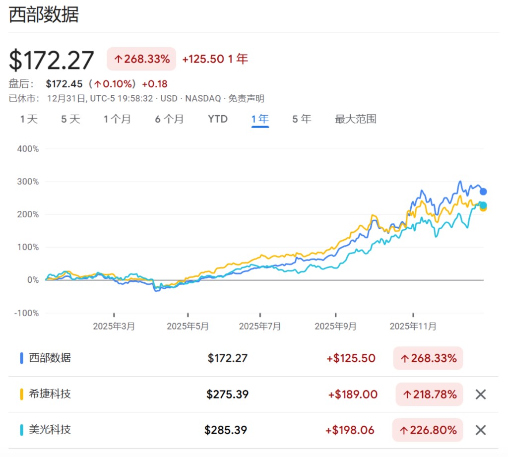 Additionally, SanDisk, which was just included in the S&P 500 at the end of the year, saw an annual increase of 559%. Although it was not officially counted in the annual "best stocks" due to its late inclusion, its popularity in the capital market after being spun off from Western Digital further confirms the logic that "storage is an essential need for AI."