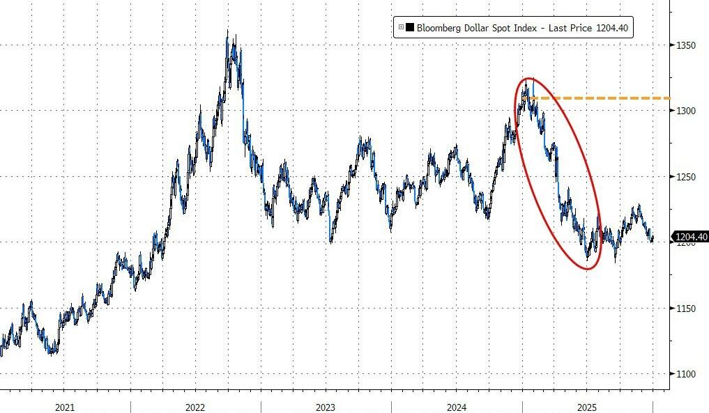 美元經歷了艱難的一年,貿易加權美元指數下跌 7%。在法幣信用動搖的背景下,資金並未如預期般大規模流向比特幣,而是瘋狂湧入貴金屬。