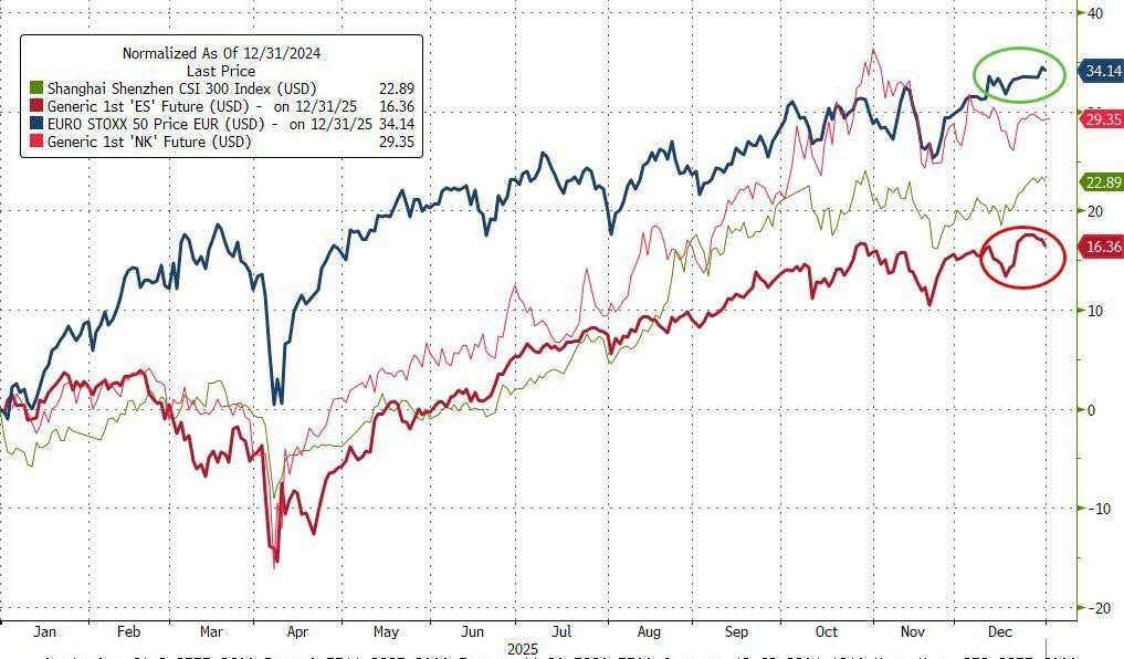 站在 2026 年的門檻上,市場面臨着更高的賭注:歷史高位的市盈率(從 21.5 倍升至 22.0 倍)、極窄的企業信貸利差、不斷膨脹的主權債務,以及天文數字般的 AI 資本開支。