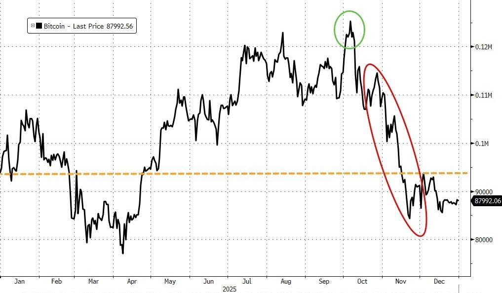 儘管曾一度突破 12.5 萬美元大關,但 BTC 最終全年收跌 6%,較峯值回落超過 30%。Pasquariello 認為: