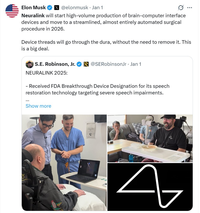 觸發此輪行情的直接導火索是 Neuralink 的最新動態。當地時間 1 月 1 日,馬斯克在社交媒體宣佈,Neuralink 將於 2026 年啓動腦機接口設備的大規模生產,並推進幾乎完全自動化的手術方案。與此同時,OpenAI 首席執行官 Sam Altman 支持的 Merge Labs 正分拆獨立,主攻利用超聲波讀取腦部活動的新技術路線。兩大科技巨頭的動作表明,腦機接口正從單一的科學實驗走向多元化的商業競速。