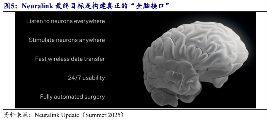 Neuralink 的技術演進路徑已十分清晰。目前,全球已有 12 人植入 Neuralink 設備,累計使用時長超過 1.5 萬小時,首位植入者 Noland Arbaugh 已能憑意念打字、玩遊戲。根據 Neuralink 的規劃,2026 年電極通道將增至 3000 個並開展盲視臨牀測試;2028 年目標單裝置電極通道超 2.5 萬個,實現全腦區域連接。
