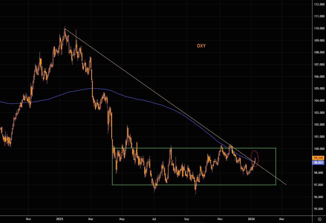 美元指數(DXY)突破了大幅下降趨勢線。沒錯,97/100 區間仍然支撐着價格,但突破 200 日均線(在本輪美元熊市中實屬罕見)將使風險倍增。這或許比表面看起來更重要……美銀 Hartnett 談美元:“美國從例外主義轉向擴張主義,是逆向做多美元的最佳時機”。