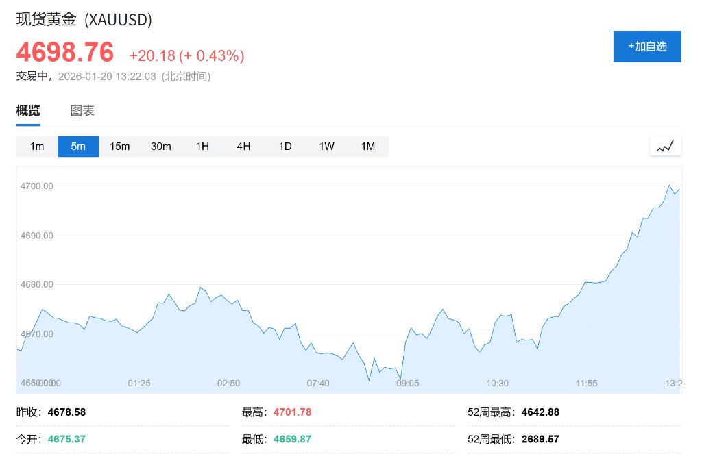 Trump's tariff threat regarding Greenland has reignited global trade tensions, triggering market risk aversion: the MSCI Asia-Pacific Index fell by 0.5%, S&P 500 futures dropped by 1%, the yield on 10-year U.S. Treasury bonds rose by 3 basis points to 4.26%, and spot gold broke through $4,700 per ounce, setting a new historical high. Although some markets, such as South Korea's stock market, showed resilience, investors are closely monitoring the potential escalation of confrontation between the U.S. and Europe, shifting funds towards gold to cope with policy uncertainty