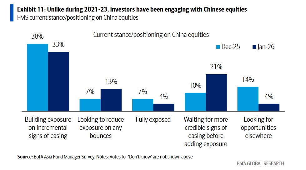 In terms of investor stance, 21% of respondents indicated that they are "building exposure," with a considerable proportion of investors maintaining a positive participation attitude, contrasting sharply with the general avoidance of the Chinese market from 2021 to 2023.