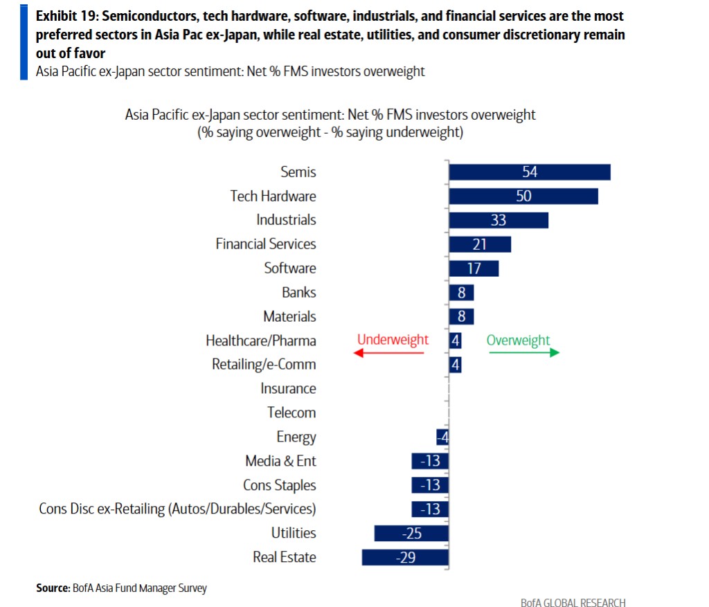 The semiconductor sector's overweight ratio across the Asia-Pacific region, excluding Japan, reached 54%, far exceeding other industries. Technology hardware, industrials, and financial services followed with net overweight ratios of 50%, 33%, and 21%, respectively. In contrast, real estate, utilities, and non-retail consumer goods sectors are the least favored, with net underweight ratios of 29%, 25%, and 13%.