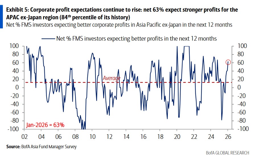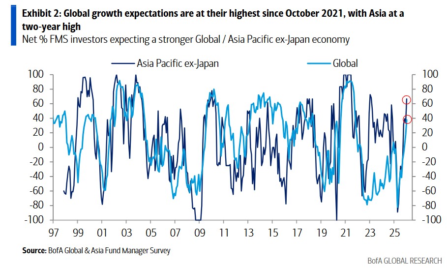 According to the Wind Trading Desk, in the January survey covering 112 fund managers managing $280 billion in assets, the return expectations for the Asia-Pacific region, excluding Japan, surged to the historical 92nd percentile, marking a two-year high. Global growth expectations have risen to the highest level since October 2021, while inflation expectations remain low at the historical 29th percentile, allowing space for Asian central banks to maintain a dovish policy stance.