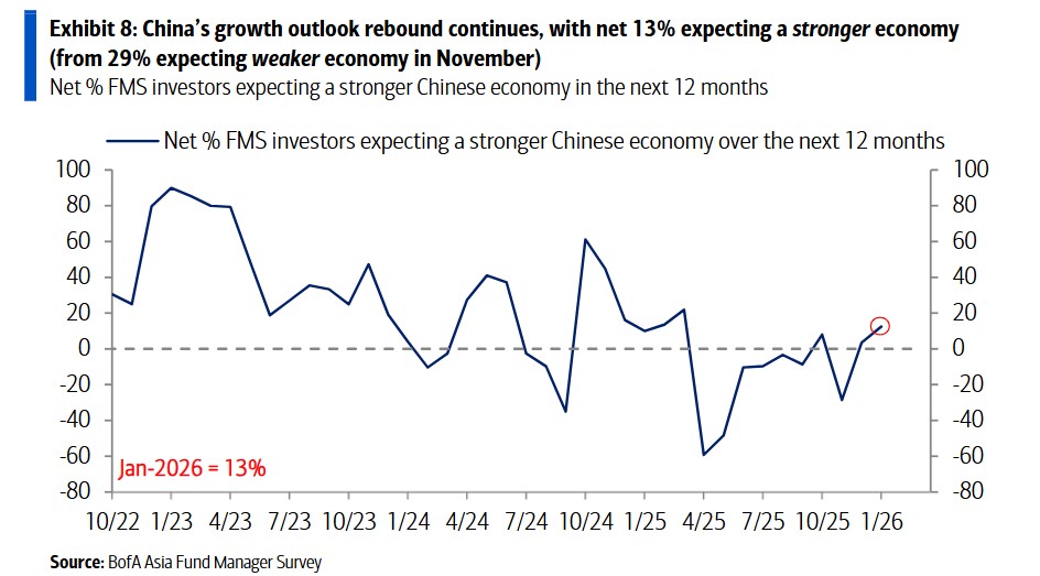 The Chinese market is experiencing a significant shift in sentiment. Growth momentum is stabilizing and gradually improving, with a net 13% of respondents expecting the Chinese economy to strengthen, marking a significant reversal from a net 29% expecting economic weakness last November
