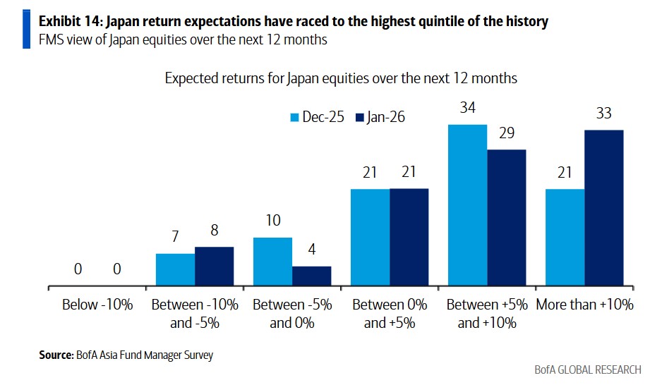 In terms of sector allocation, banks and semiconductors continue to be favorites among investors in the Japanese market, with 50% and 38% of respondents overweighting these two sectors, respectively. Banks are key beneficiaries of rising interest rates, while semiconductors are core targets of AI investment themes. Return expectations for the Japanese market have risen to the highest historical quintile, with 33% of respondents expecting returns exceeding 10% over the next 12 months.