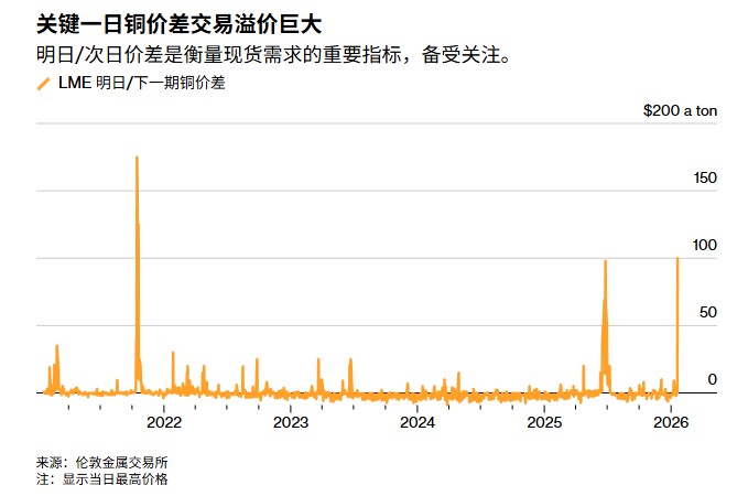 週二,LME 期銅的 Tom/Next 價差一度升至每噸 100 美元,達到 2021 年曆史性供應擠壓以來的最高水平。該價差在前一交易日仍處於貼水狀態,短時間內的急劇反轉成為自 1998 年以來罕見的極端波動之一。