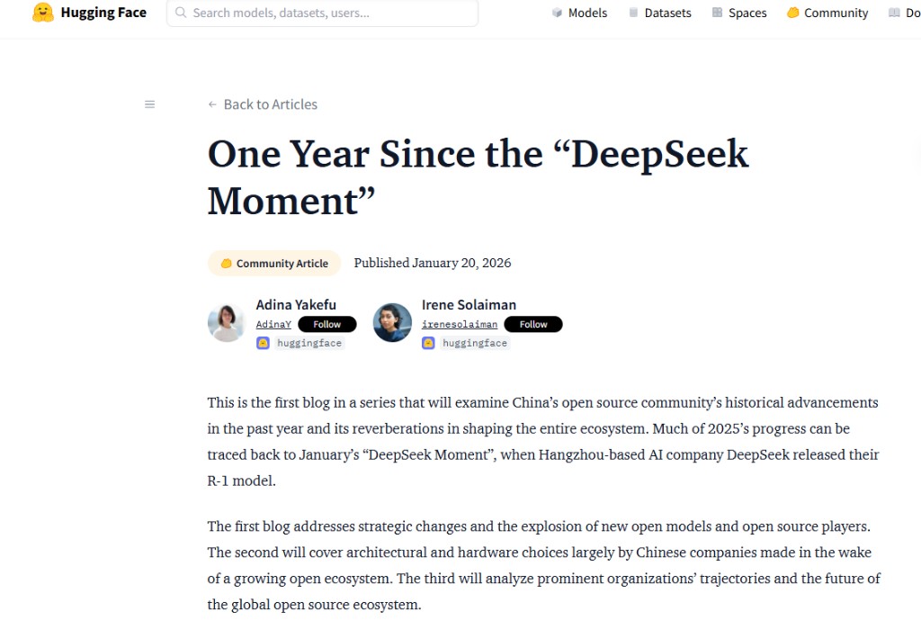 1 月 20 日,全球最大的 AI 開源社區 Hugging Face 發佈深度文章——《“DeepSeek 時刻” 一週年》,詳述了中國 AI 力量在過去一年如何重塑全球開源生態。