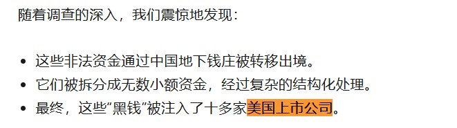 According to Capitalwatch, their team discovered astonishing funding routes while tracing the illegal transfer of billions of dollars from the now-defunct Chinese P2P platform "TuanDai Wang." The article states: "These illegal funds were transferred out of the country through underground banks in China; they were split into countless small amounts and underwent complex structured processing; ultimately, this 'dirty money' was injected into more than a dozen U.S. listed companies."