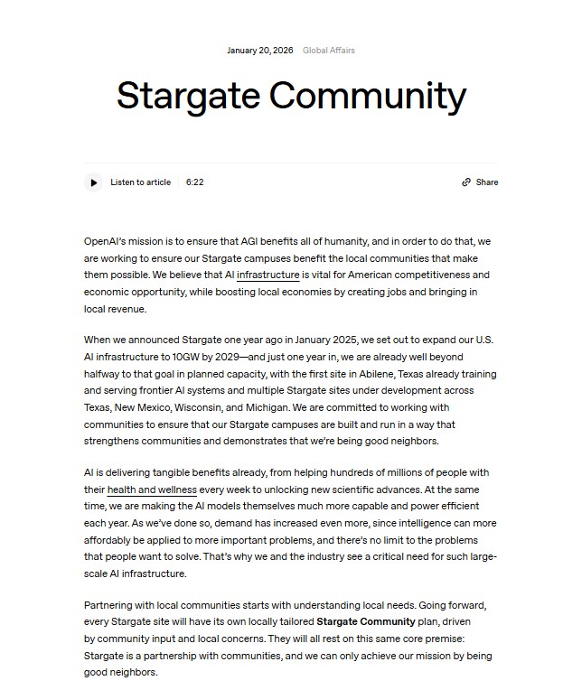 The ChatGPT maker stated that it will work with the community where the project is located to customize plans based on local needs, including paying for additional grid infrastructure costs or securing energy supply independently. Stargate is a multi-year AI infrastructure construction plan valued at $500 billion, jointly promoted by OpenAI and its partners SoftBank and Oracle.