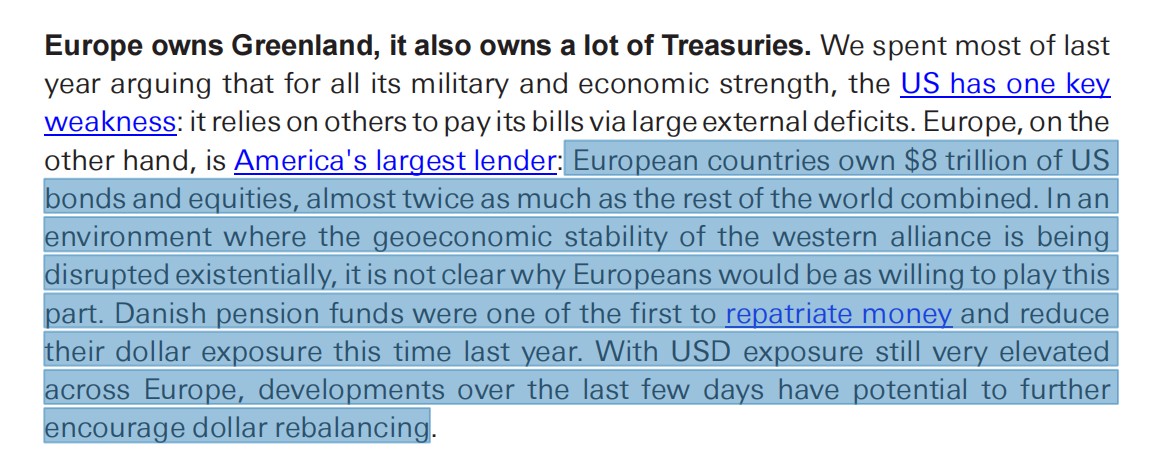 In this regard, George Saravelos, head of foreign exchange research at Deutsche Bank, warned in a report last Sunday that Europe holds nearly $8 trillion in U.S. assets (including bonds and stocks), which constitutes a key bargaining chip in a potential "capital war." If the dispute over Greenland escalates, Europe may employ countermeasures, imposing regulatory or tax measures on U.S. assets. This move would pose a more substantial threat to the U.S. financial market than traditional tariffs, directly impacting the U.S. Treasury market and the credit of the U.S. dollar.