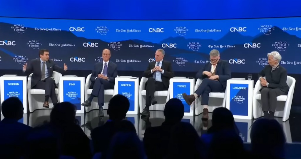 在2026年世界经济论坛次日的重磅小组讨论中,全球最大的资产管理公司贝莱德CEO、“华尔街教父”拉里·芬克(Larry Fink,管理14万亿美元资产)、最成功的对冲基金之一城堡证券创始人肯·格里芬(Ken Griffin,管理650亿美元资产)、欧洲央行行长克里斯蒂娜·拉加德(Christine Lagarde)以及著名经济历史学家亚当·图兹(Adam Tooze)齐聚一堂。