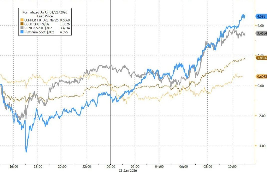 現貨黃金漲超 2.2%,刷新歷史高位至將近 4940 美元。紐約期銀漲 4%,現貨鉑金漲超 6.3%,雙雙創歷史新高。